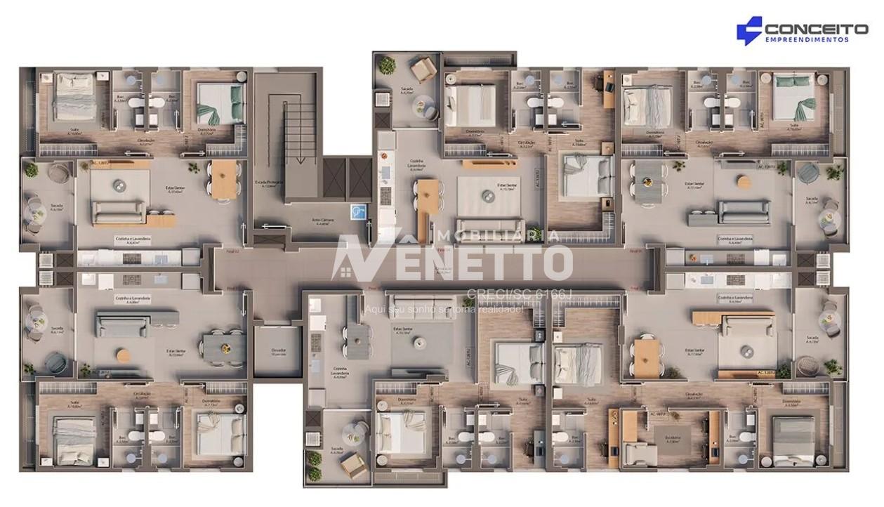 Diferenciais dos Apartamentos: - Sacadas com churrasqueira e vista panorâmica - Sala e cozinha integradas - Acabamento em porcelanato nas áreas sociais - Piso laminado nos dormitórios - Infraestrutura para climatização