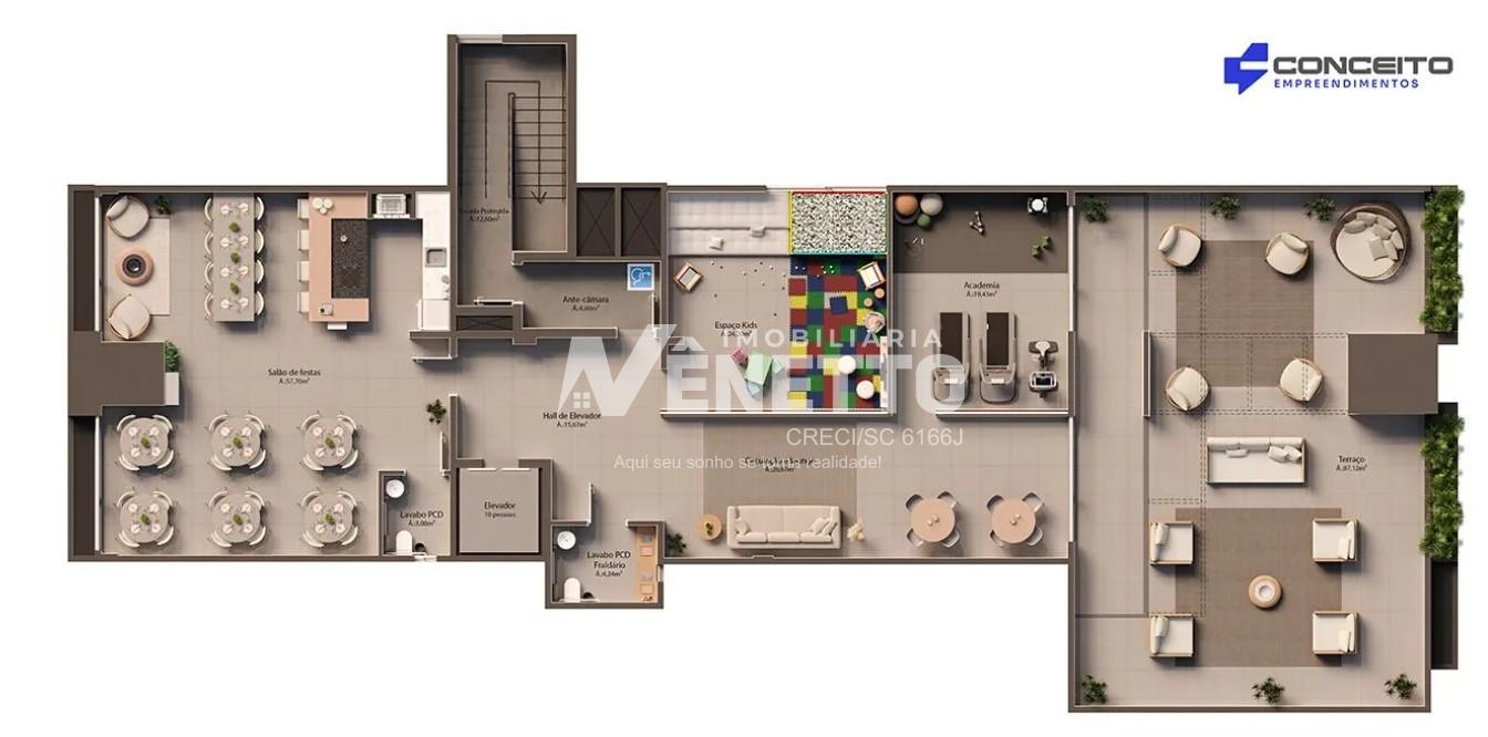 Diferenciais do Empreendimento: - Rooftop com área decorativa - Terraço com pergolado - Salão de festas - Academia - Espaço Kids - Playground - Espaço Pet - Bicicletário - Hall de entrada decorado - Lavabo para uso comum - Duas salas comerciais - Elevador de alta performance - Vagas de garagem cobertas